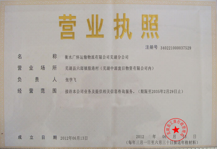 衡水广怀运输物流有限公司芜湖分公司营业执照(正本)